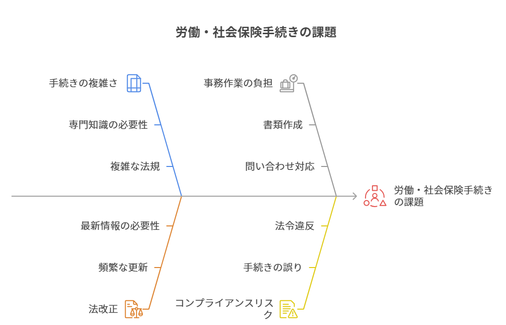 労働・社会保険に関する手続きは、複雑かつ頻繁な法改正に対応する必要があり、専門知識と時間が必要です。弊所がこれらの手続きを代行することで、貴社は煩雑な事務作業から解放され、人事労務部門の生産性向上に貢献します。正確かつ迅速な手続きにより、社員の皆様も安心して働くことができるようサポートいたします。