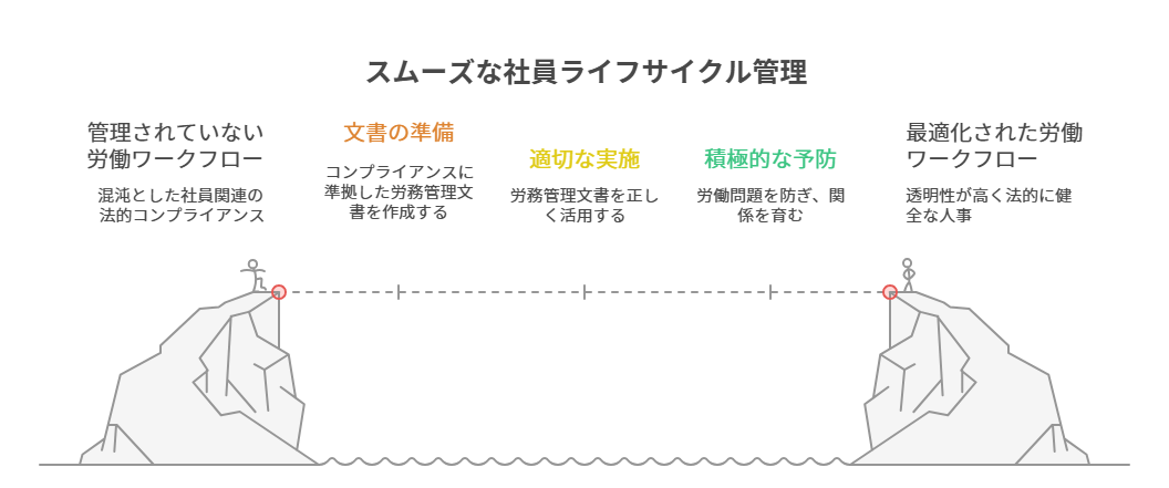 ✔ 社員との労働契約の締結(採用)から解除(退職/解雇)までに訪れる様々な労働条件の運用、決定、変更、改廃、解除などの手続きについて適正、公正なやり方がわからない